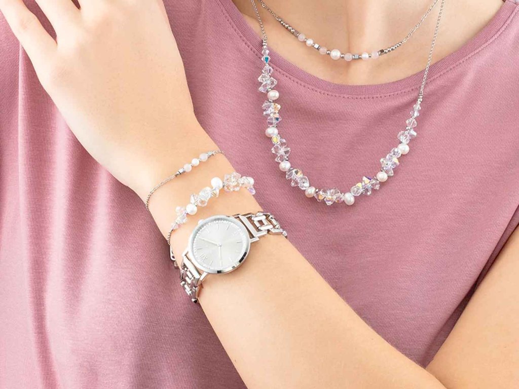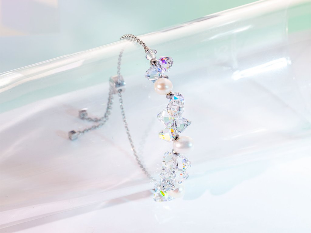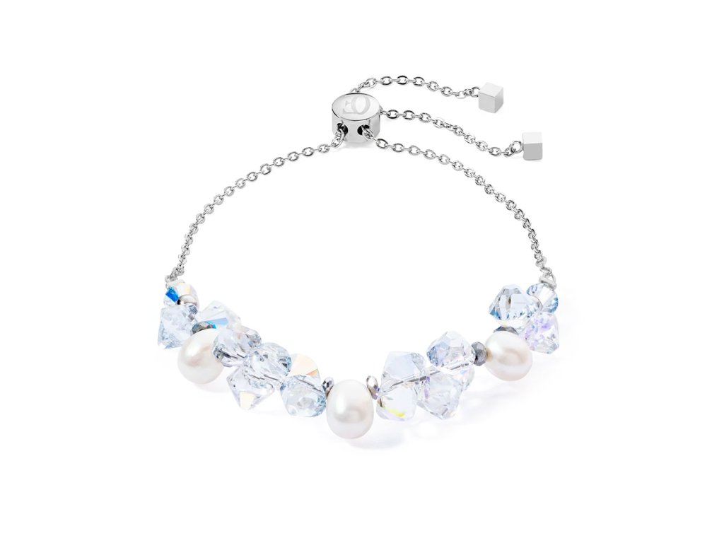Třpytivé krystaly Swarovski®, doplněné o jemné sladkovodní perly, vytvářejí dokonale vyvážený kontrast světla a hebkosti. Minimalistický design zjemňují ocelové detaily a posuvný uzávěr, který zaručuje pohodlné nošení a přizpůsobení každému zápěstí.