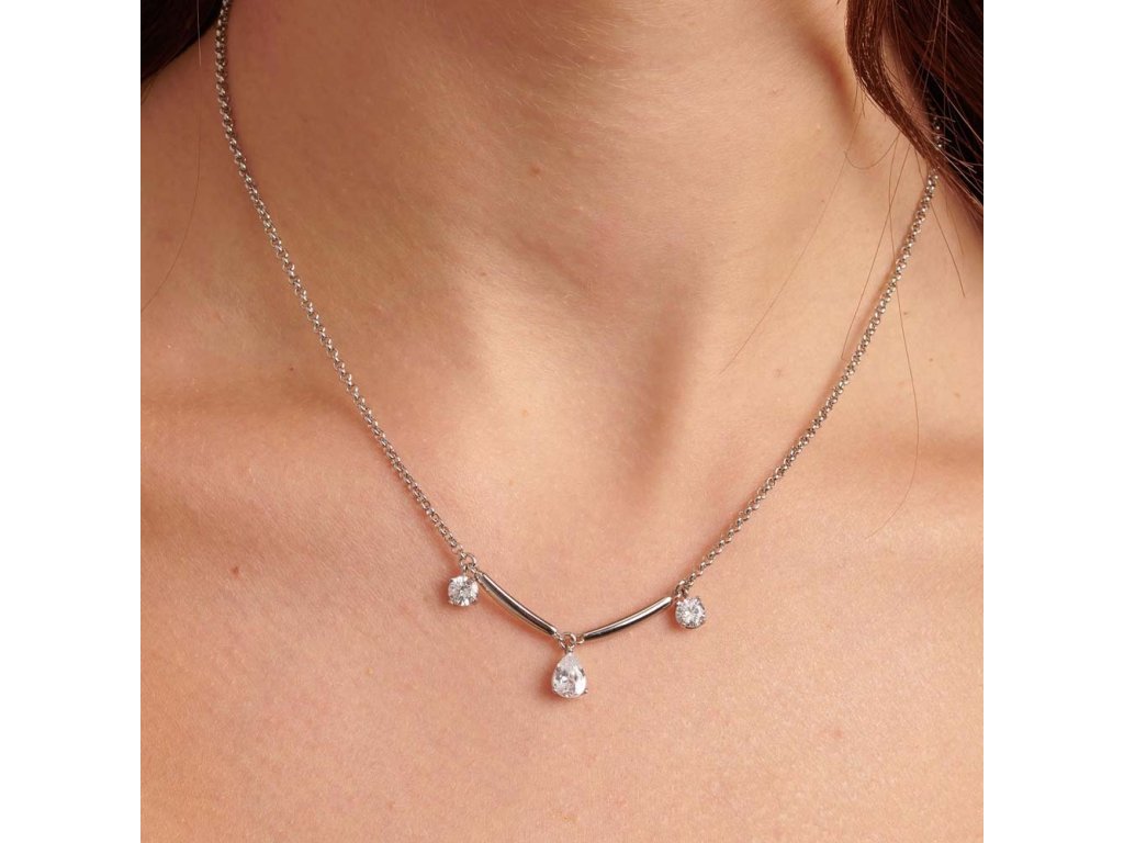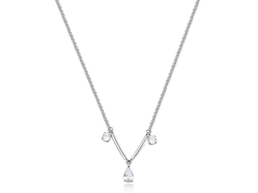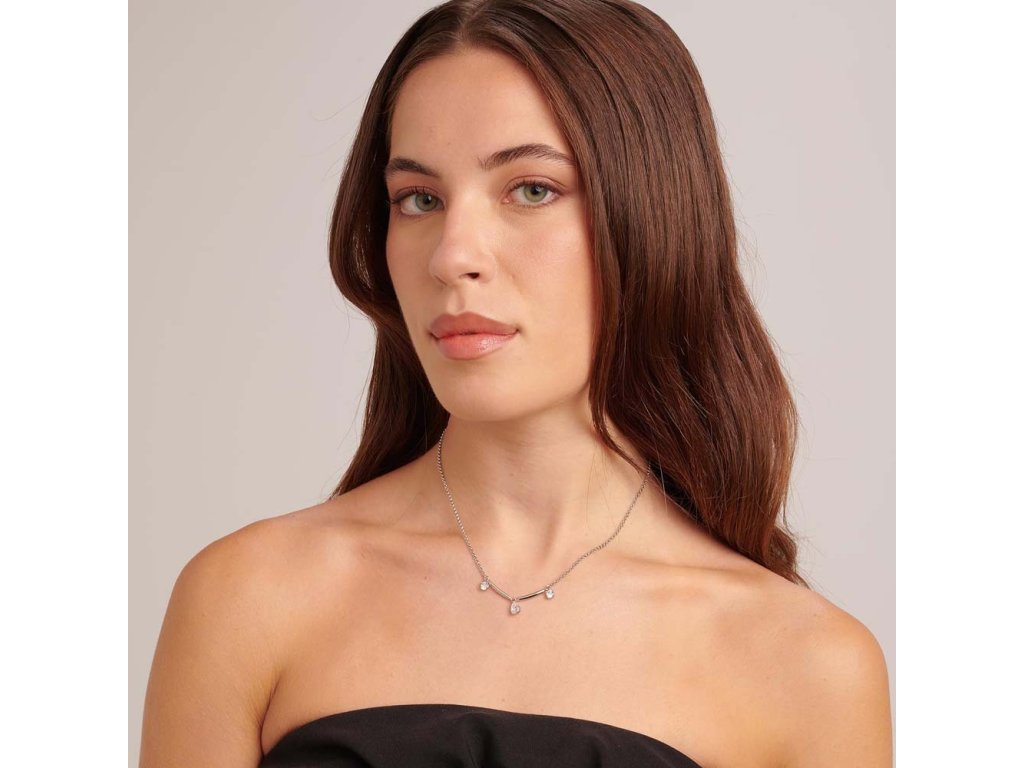Propracovaný tvar do elegantního "V" spolu s kapkovitým centrálním krystalem tvoří dokonale vyváženou kompozici – jemnou, ale nepřehlédnutelnou. Zapínání na ocelovou karabinu a prodlužovací řetízek zajišťují pohodlí i styl.
