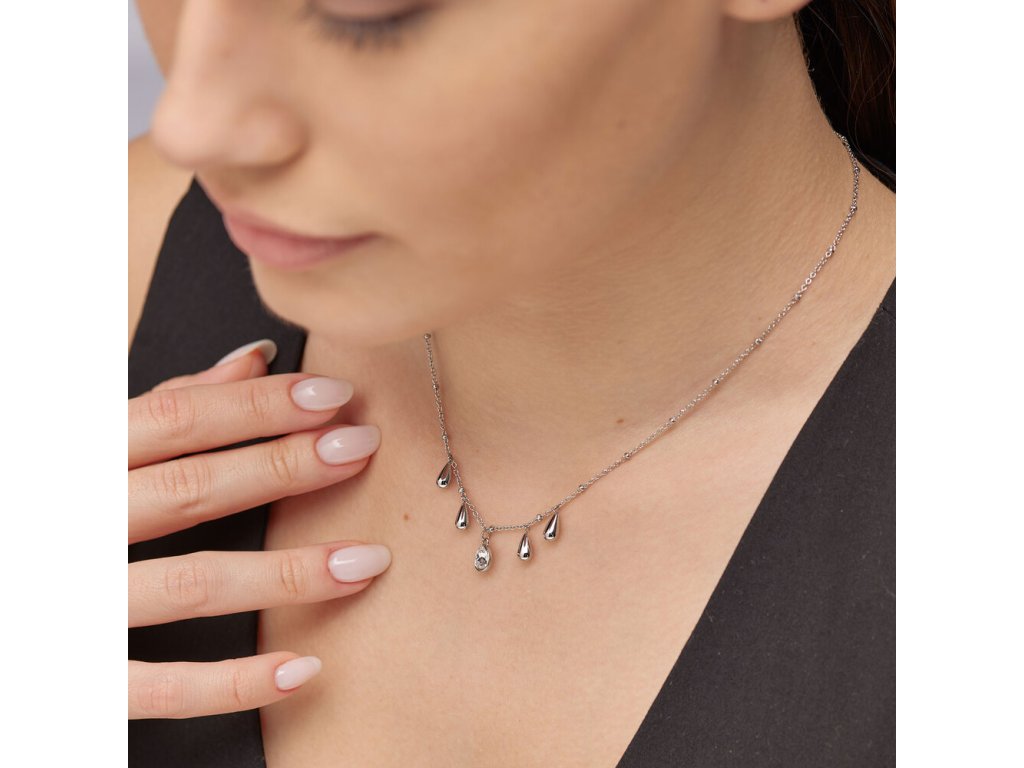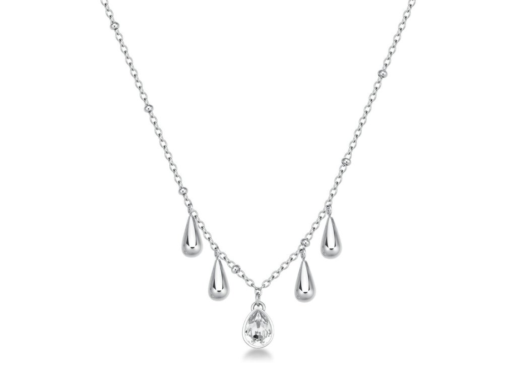 Na jemném řetízku se třpytí pět přívěsků ve tvaru kapky, z nichž ten středový je osazený broušeným čirým krystalem, který zachycuje světlo jako kapka rosy. Náhrdelník krásně kopíruje linii krku a dodává šmrnc i těm nejjednodušším outfitům.