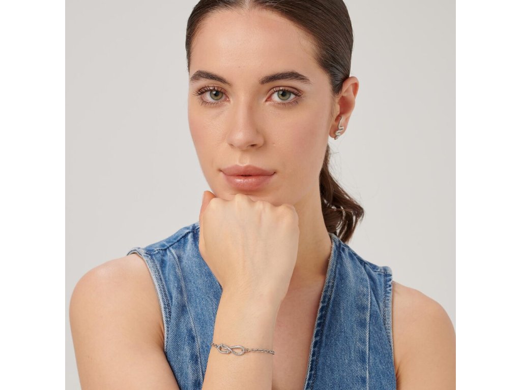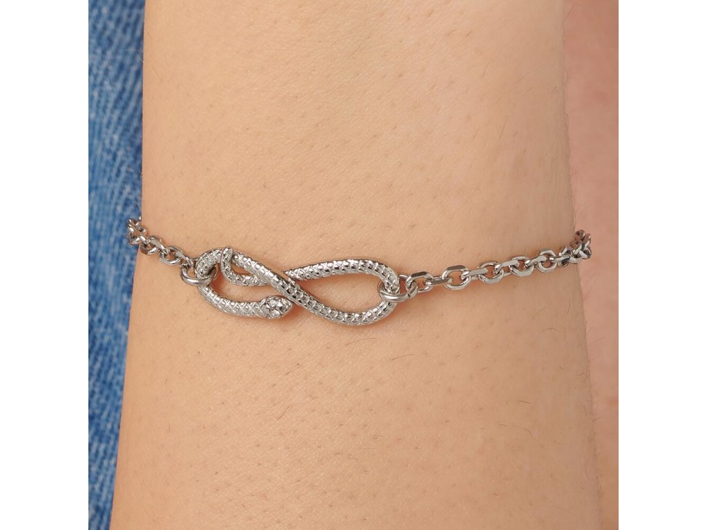 Vyroben z chirurgické oceli 316L, je odolný, stálobarevný a hypoalergenní. Dominantním prvkem je symbol nekonečna v podobě elegantního hada, zdobený dvěma čirými krystaly, které dodávají šperku jemný třpyt. Maximální délka náramku je 18 cm, součástí je i prodlužovací očko pro ideální přizpůsobení zápěstí.