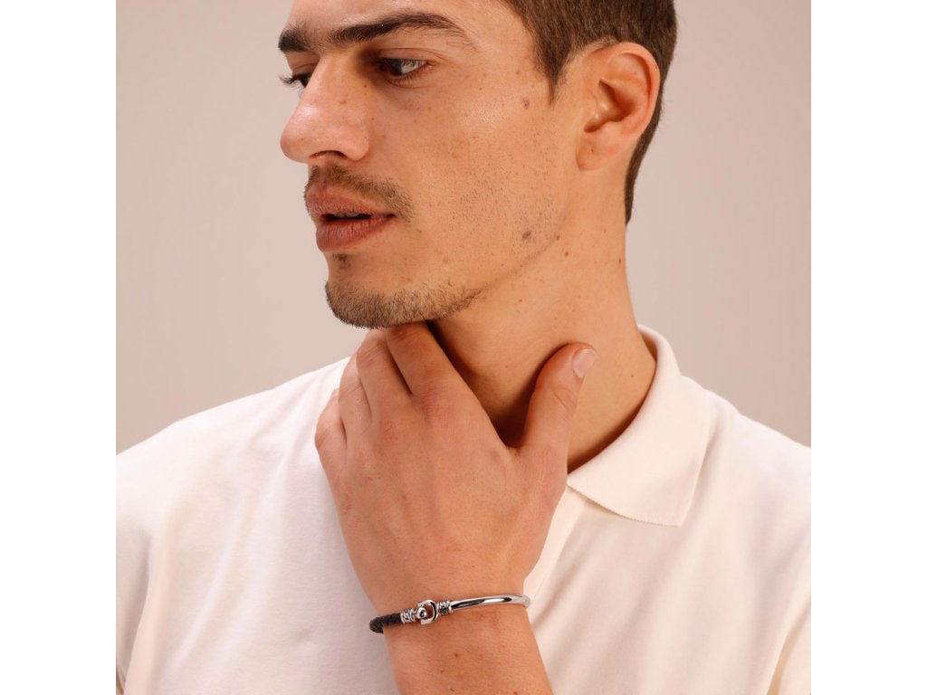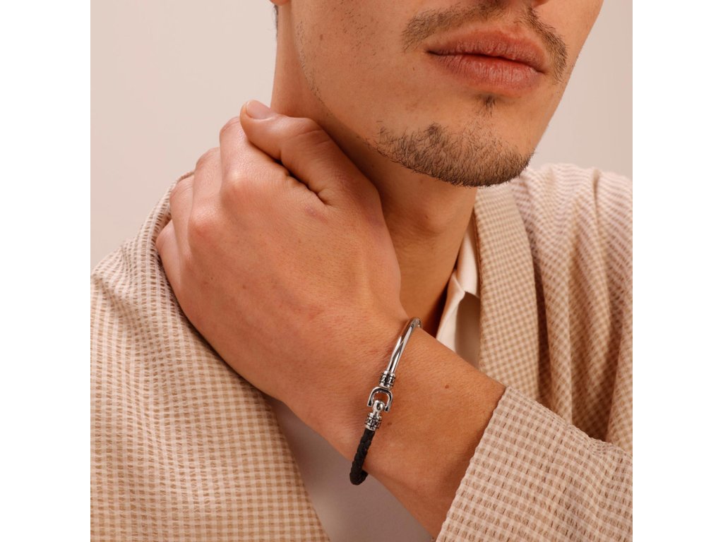 Náramek Brosway Knocker BKC14 je nepřehlédnutelným doplňkem pro muže, kteří milují originalitu i styl. Spojení lesklé chirurgické oceli 316L, černého smaltu a splétané imitace kůže vytváří výrazný design, který zaujme na první pohled.