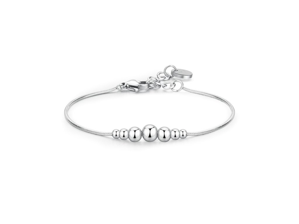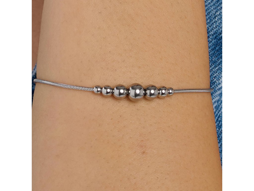 Na lesklém náramku typu hádek jsou pravidelně navlečeny ocelové korálky různé velikosti, které vytvářejí harmonický středový motiv. Minimalistický styl umožňuje snadné kombinování s dalšími šperky, ať už v práci, ve volném čase nebo při slavnostních příležitostech.