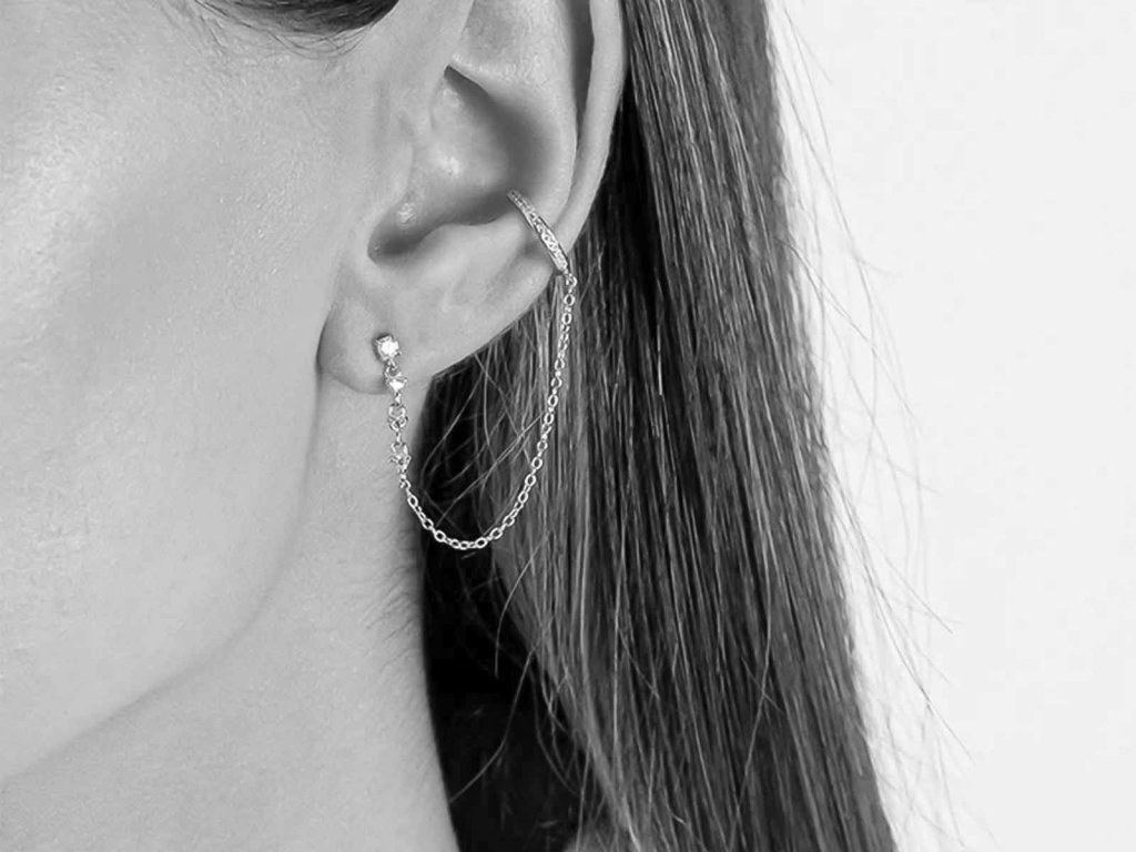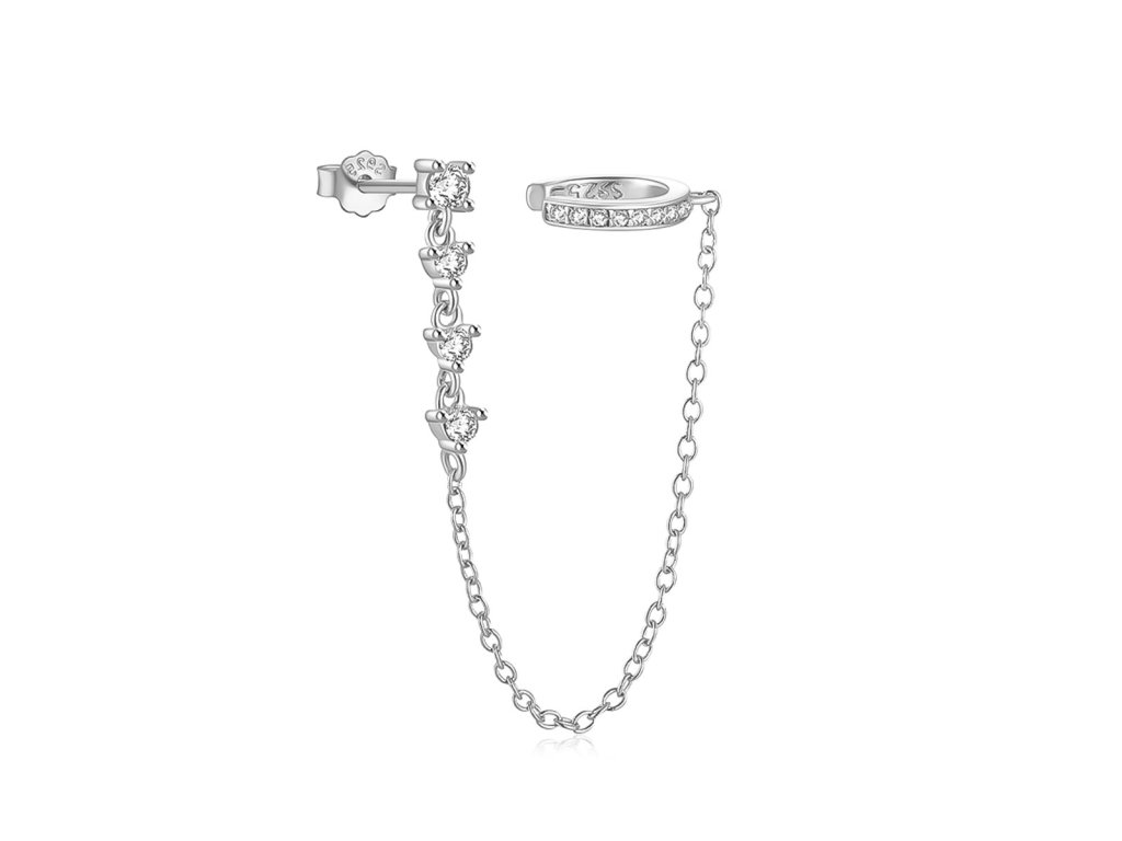 Tato výrazná a přesto elegantní stříbrná záušnice – earcuff spojuje klasickou peckovou náušnici s horním kroužkem pomocí jemného řetízku. Linie třpytivých zirkonů působí luxusně, zatímco řetízek dodává šperku lehkost a dynamiku při každém pohybu.