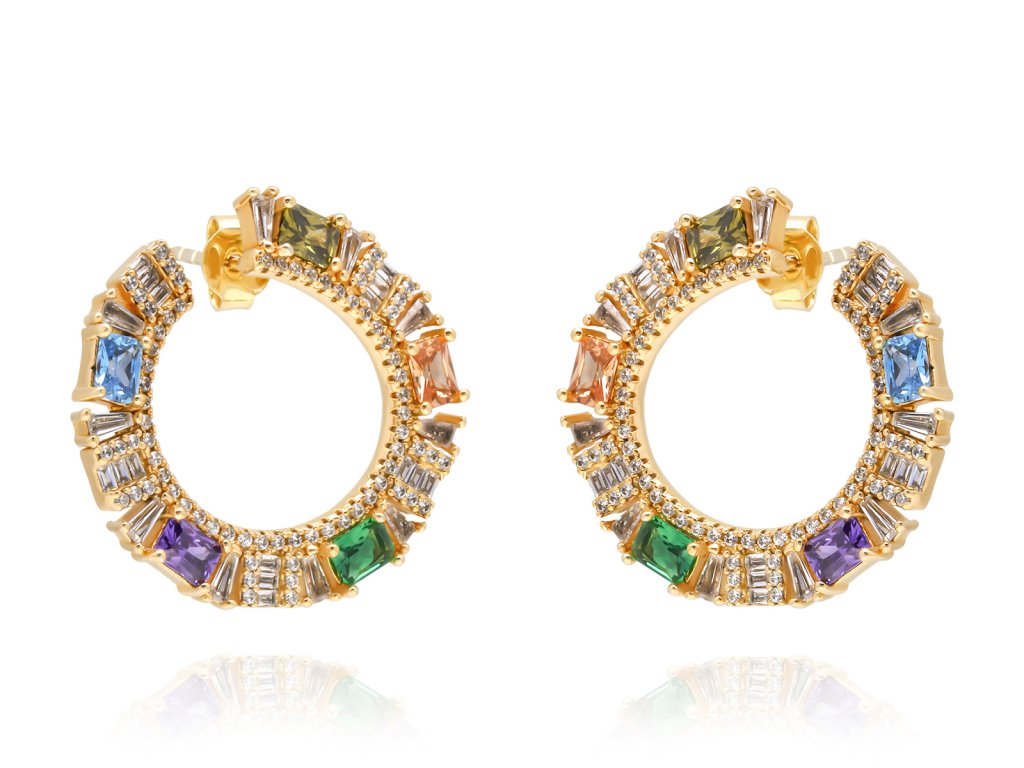Tyto náušnice z kolekce Buenos Aires jsou dokonalým spojením italského designu a barevné energie. Kruhový design je zdobený bohatou kombinací zelených, modrých, oranžových, fialových a čirých zirkonů, které vynikají ve tvarech princess, baguette a kulatém.