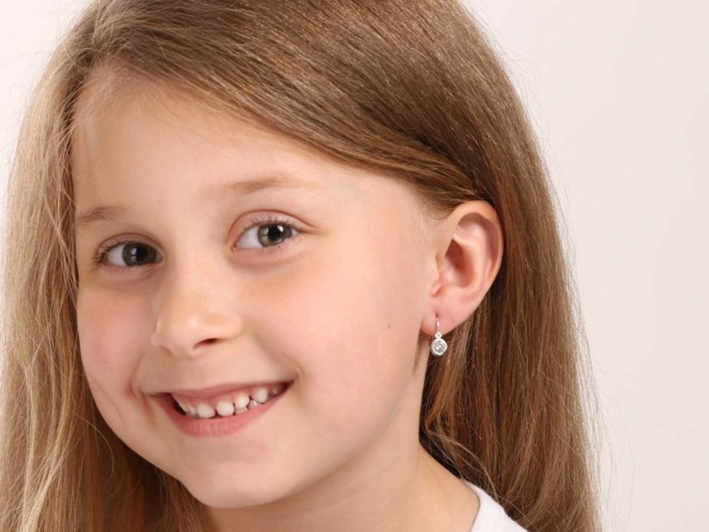✔ Třpytivý bílý zirkon – klasická elegance v dětském provedení