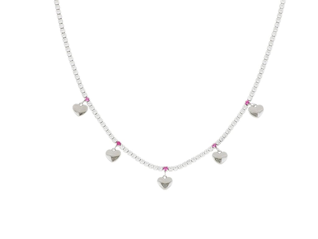 Model Amore a Mezzanotte z kolekce Cuori Milano přináší harmonii elegance a romantiky. Jemný řetízek ve stylu tenisového náhrdelníku je osazen čirými zirkony a doplněn růžovými akcenty. Mezi nimi se jemně houpají drobná srdíčka, která symbolizují něžnost, cit a lásku.
