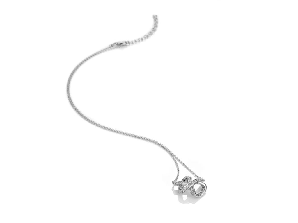 Náhrdelník Aurora zaujme propracovaným přívěskem s moderními zatočenými tvary, které symbolizují plynulost a nekonečnou energii. Povrch je osazen zářivými bílými topazy, jež nádherně odrážejí světlo. Luxusní akcent dodává pravý přírodní diamant (0,01 ct), který podtrhuje výjimečnost celého šperku.