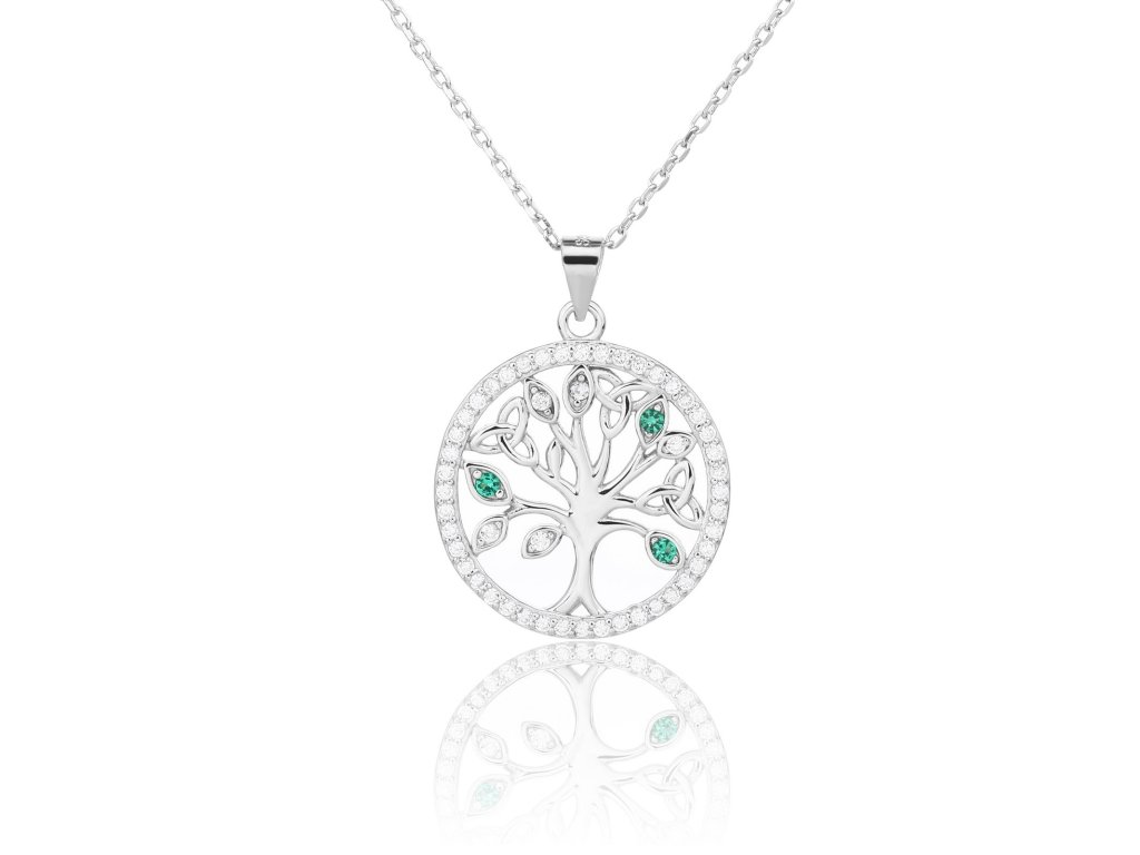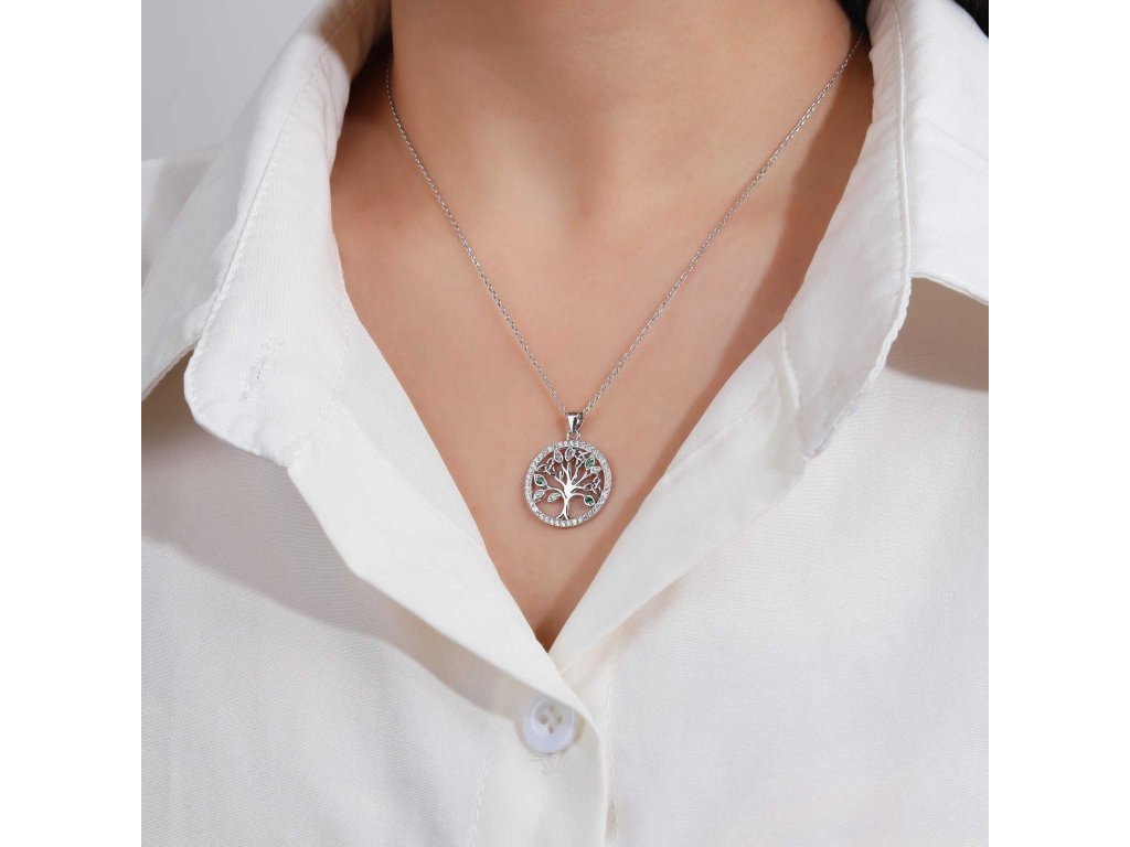 Tento elegantní stříbrný náhrdelník se symbolem Stromu života je talismanem stability, růstu a spojení s přírodou. Zdobí ho jemné čiré a zelené zirkony, které připomínají listy plné svěžesti a naděje. Kruh posetý třpytem zirkonů dodává šperku luxusní vzhled a podtrhuje jeho duchovní význam.