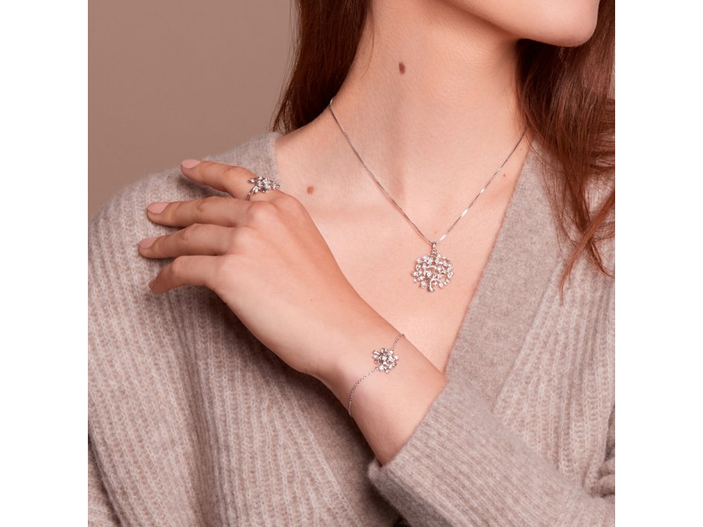 Tento stříbrný náramek s motivem stromu života v sobě nese hlubokou symboliku růstu, stability a propojení s přírodou. Precizně propracovaný design větví a listů dodává šperku jemnost, zatímco osazení třpytivými topazy podtrhuje jeho elegantní vzhled.