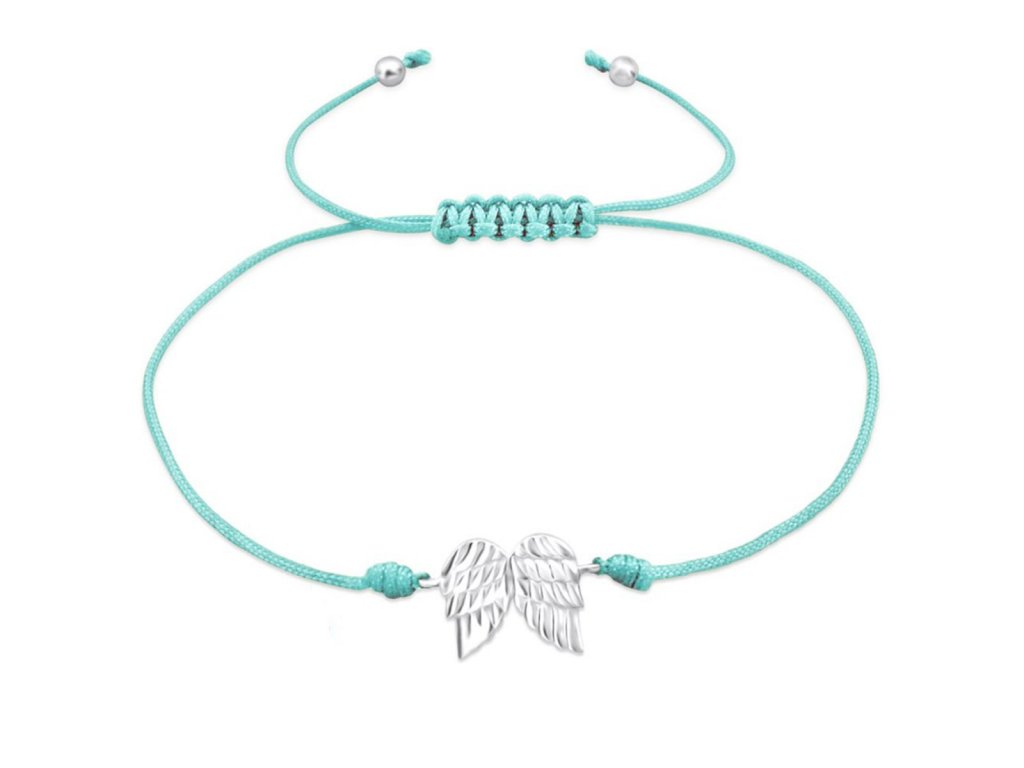 Náramek s andělskými křídly – něžný symbol ochrany a bezpečí. Tyrkysová šňůrka a lesklé stříbro tvoří jemný šperk s hlubokým významem. 💫