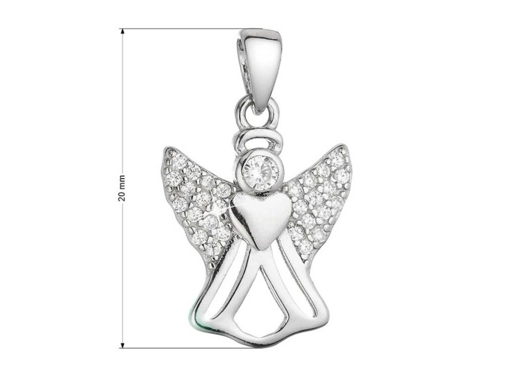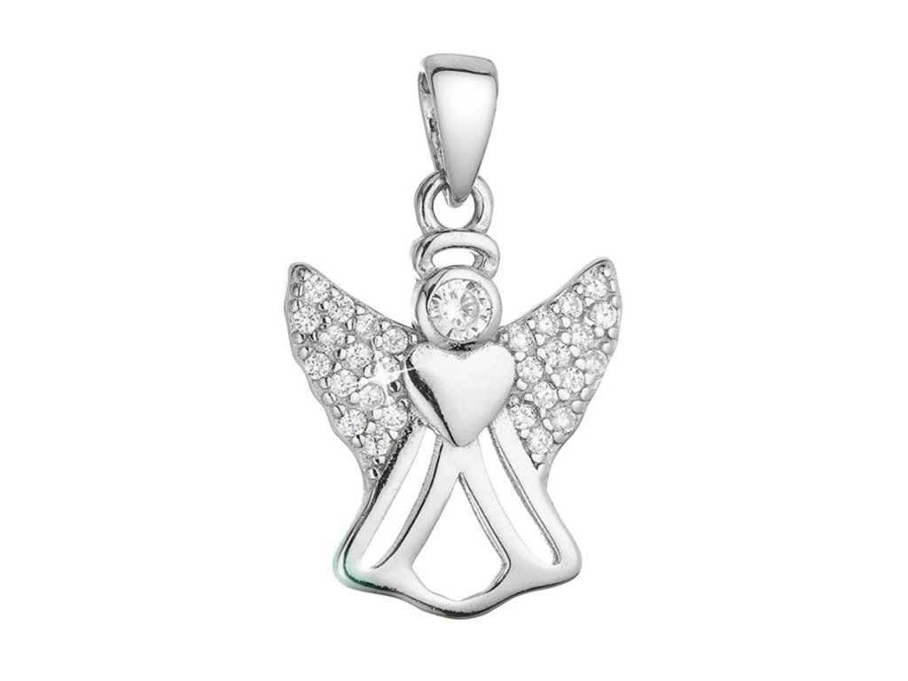 Tento kouzelný přívěsek je symbolem lásky, ochrany a víry. Z ryzího stříbra vznikl šperk v podobě anděla, jehož křídla jsou osázena třpytivými zirkony v barvě crystal. Uprostřed zdobí anděla jemné srdce, které mu dodává jedinečný význam. Rhodiovaná úprava zajišťuje dlouhotrvající lesk a chrání šperk před zčernáním. Velikost (20 mm) z něj činí ideální doplněk k řetízku i krásný talisman pro každodenní nošení.