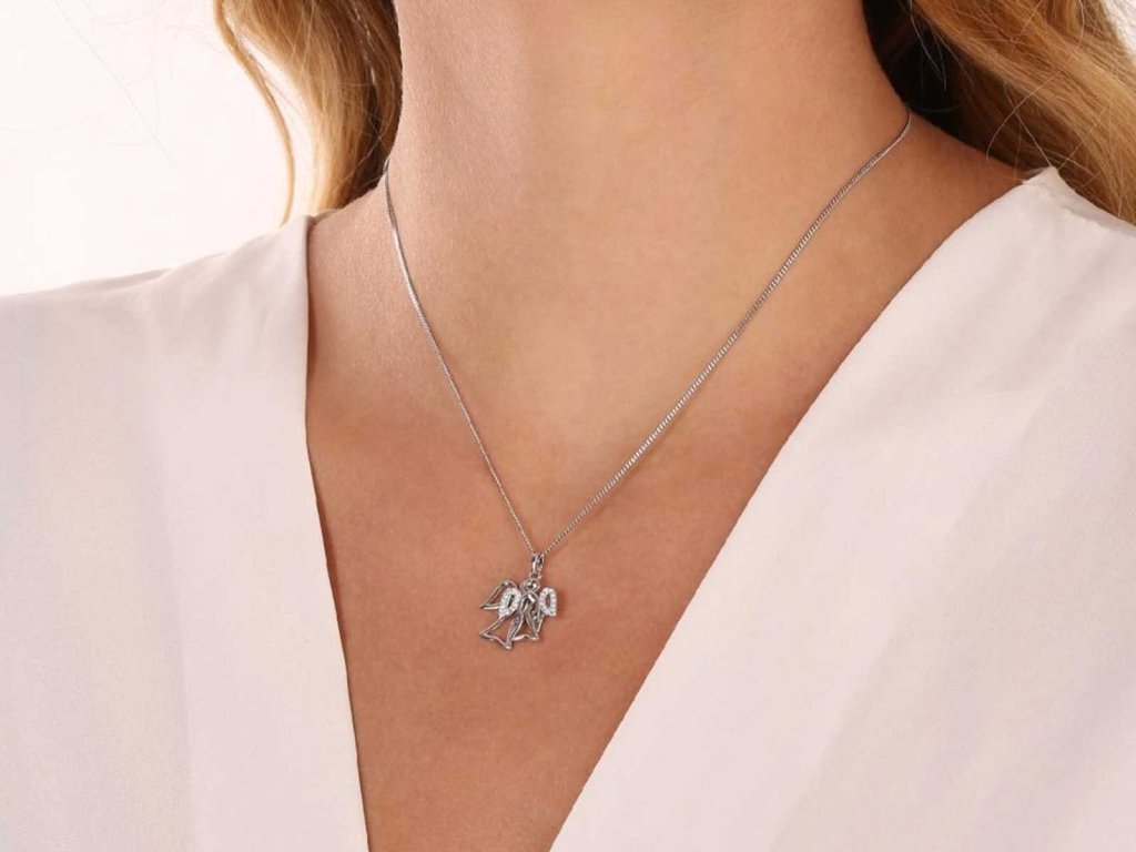 Tento půvabný přívěsek nese v sobě symbol ochrany a víry. Z ryzího stříbra vznikl šperk se siluetami andělů, jejichž křídla jsou osázena čirými zirkony v barvě crystal. Rhodiovaná úprava mu dodává zářivý lesk a chrání ho před zčernáním. Jeho něžný design (18 × 16 mm) se stane krásným talismanem pro každodenní nošení i výjimečné příležitosti.
