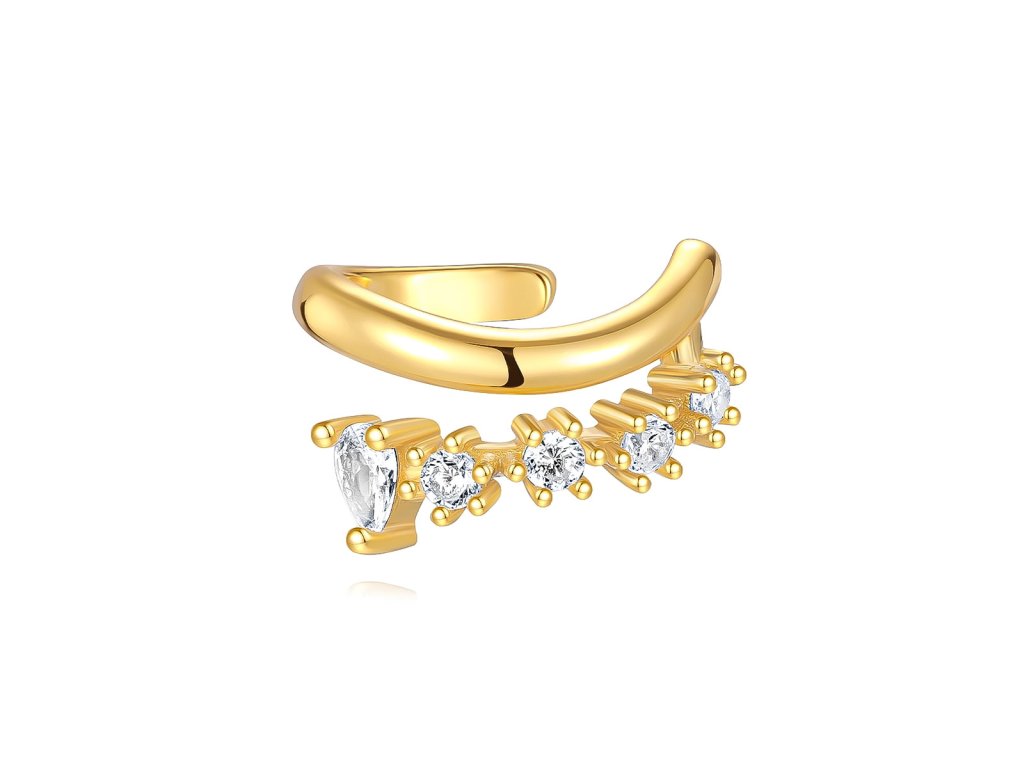 Tento stříbrný ear cuff pozlacený žlutým zlatem zaujme svým jemným, ale výrazným designem. Spodní linie je zdobená řadou třpytivých zirkonů, které postupně vytvářejí krásný světelný efekt. Dominantou je větší kámen na kraji, který dodává šperku luxusní charakter.