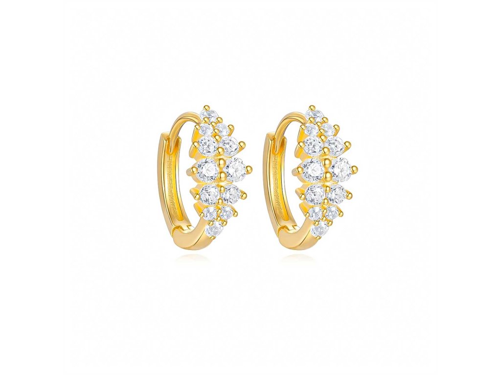Tyto zlacené náušnice ze stříbra 925 spojují nadčasový kruhový tvar s bohatě osazenou přední částí. Kulaté zirkony vytváří kompaktní třpytivou kompozici, která působí luxusně, ale stále velmi elegantně.