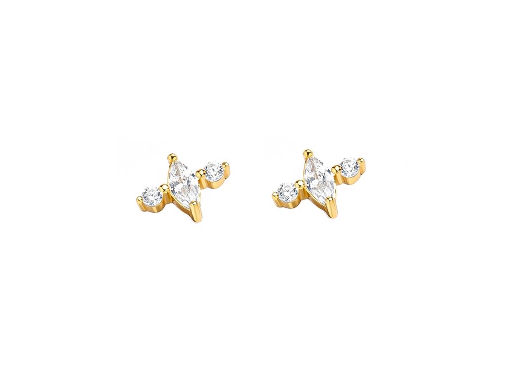 Zlacené náušnice ze stříbra 925 zdobí harmonická kombinace čirých zirkonů různých tvarů. Dominantní centrální kámen v markýzovém brusu je doplněn dvojicí kulatých zirkonů po stranách, které vytvářejí vyvážený a velmi něžný celek.