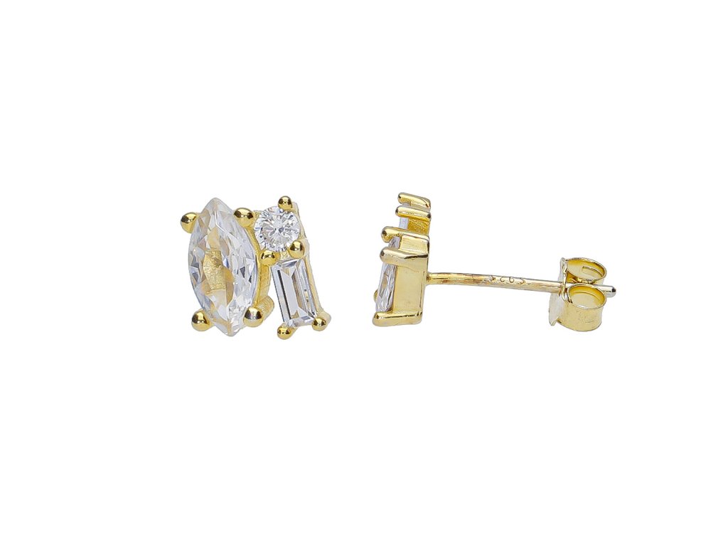 Zlacené náušnice ze stříbra 925 zdobí kombinace tří broušených zirkonů různých tvarů, které společně tvoří harmonický a originální celek. Dominantní podlouhlý kámen ve tvaru markýzy doplňuje kulatý zirkon a obdélníkový kámen s precizním brusem, jenž nádherně odráží světlo.