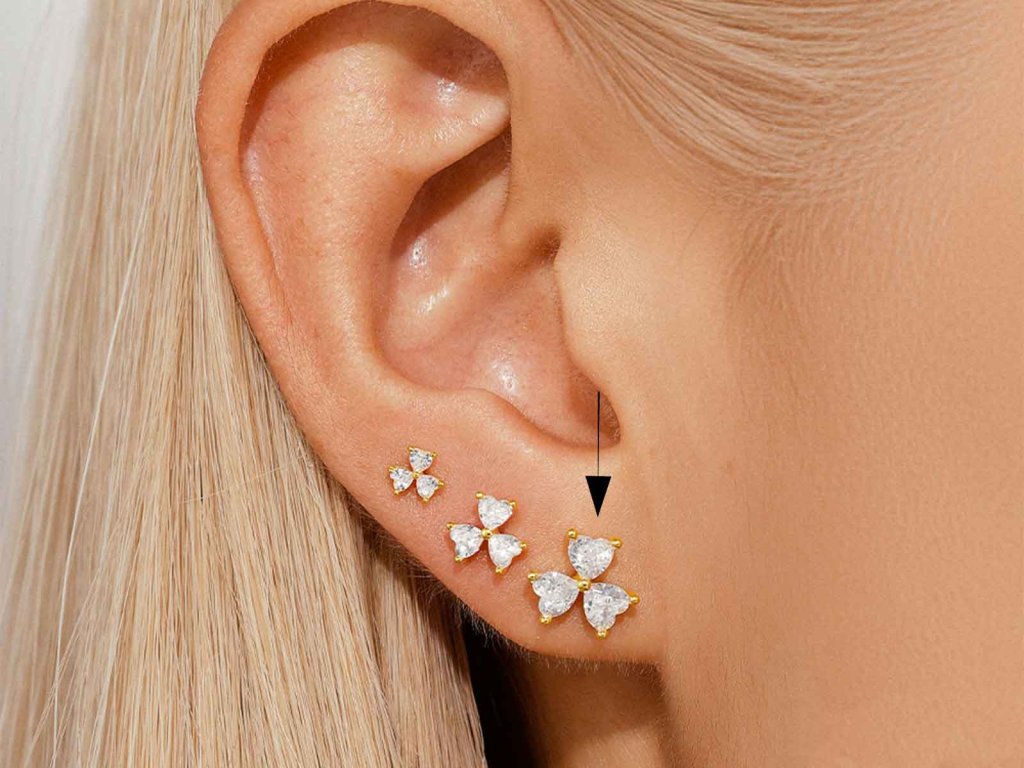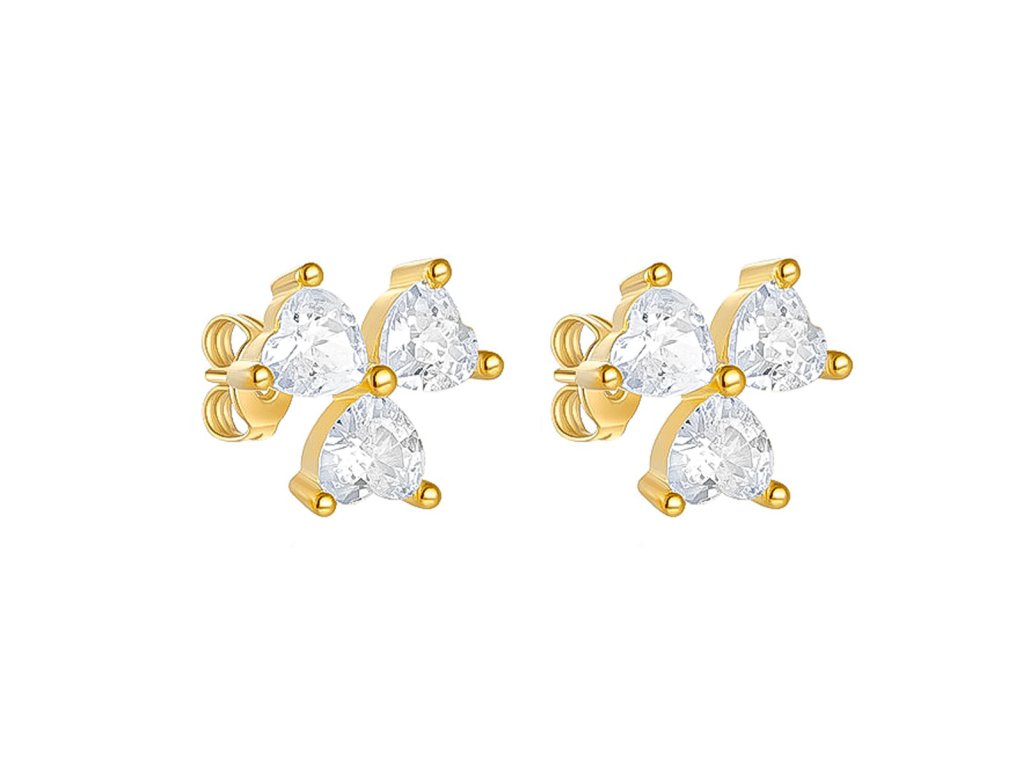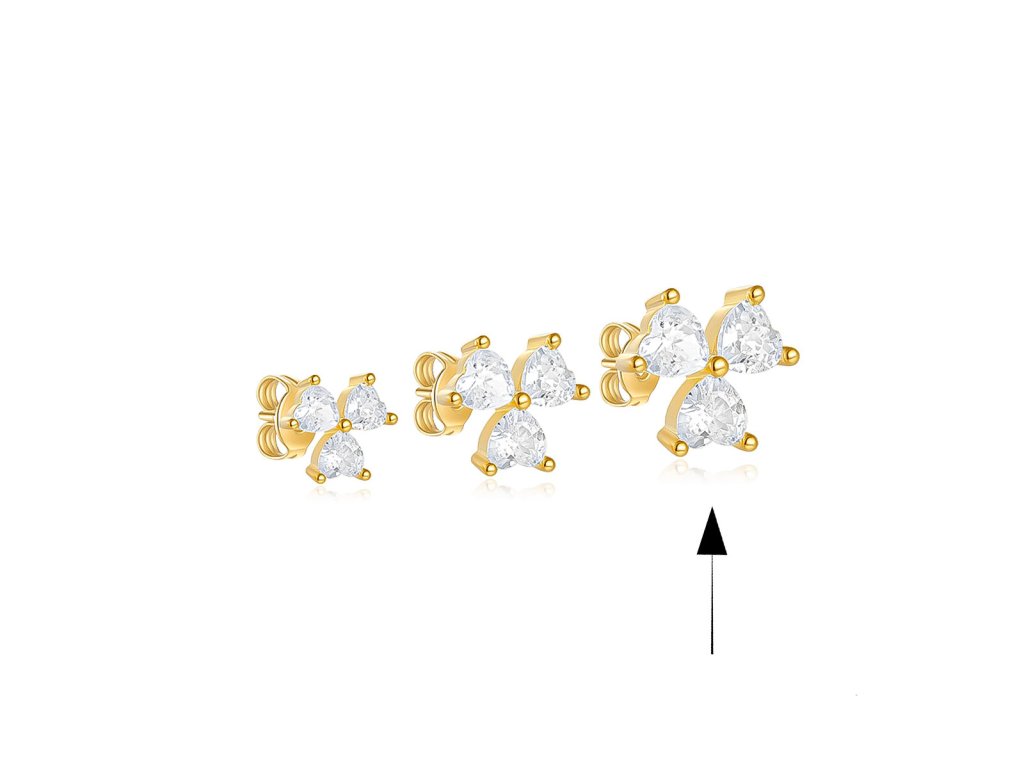 Tyto nádherné zlacené náušnice ze stříbra 925/1000 zdobí tři třpytivé zirkony ve tvaru srdce, které společně vytvářejí jemnou, ale výraznou kompozici. Spojení teplého zlatého odstínu a čirého lesku kamínků působí luxusně, něžně a velmi ženský.
