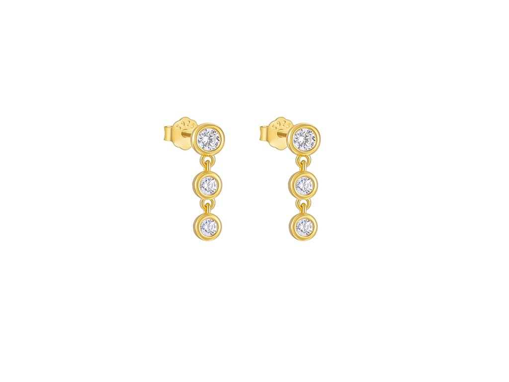 Tyto zlacené náušnice ze stříbra 925 jsou tvořeny třemi kulatými zirkony usazenými pod sebou v hladkém, moderním lůžku. Jednoduché linie a symetrické uspořádání kamenů vytvářejí nadčasový vzhled, který se hodí jak k běžnému outfitu, tak i ke slavnostním příležitostem.