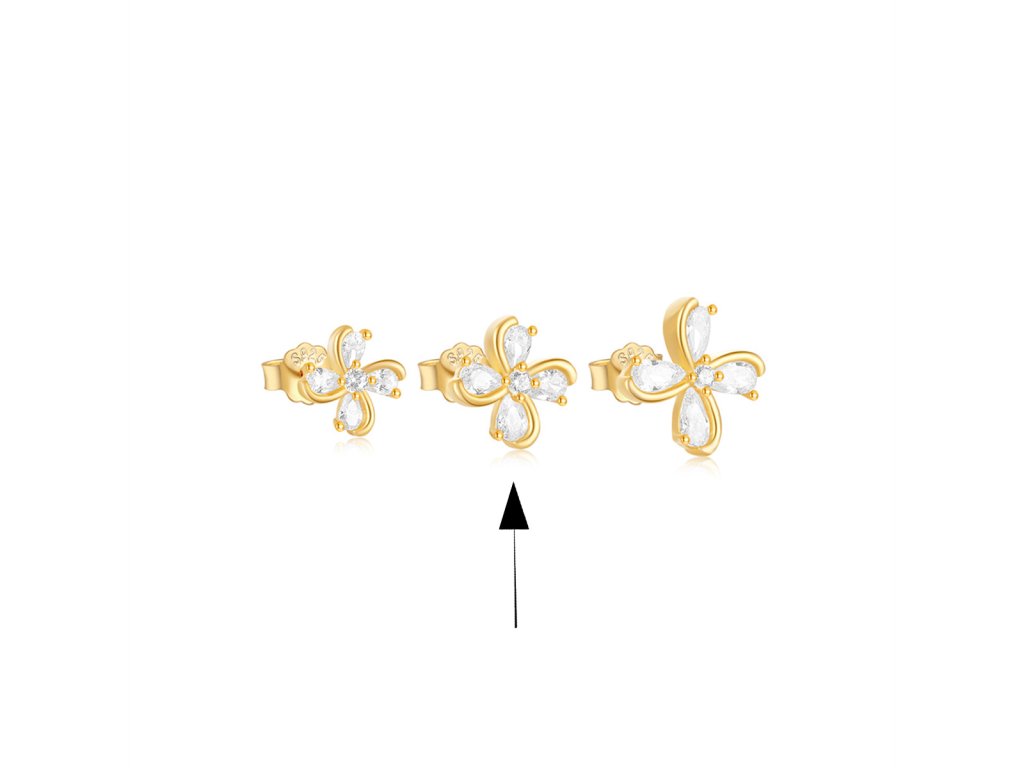 Tyto něžné zlacené náušnice ze stříbra 925/1000 zdobí čtyři okvětní lístky osazené čirými zirkony, které vytvářejí harmonický květinový motiv. Kombinace teplého zlatého tónu a třpytivých kamínků působí velmi ženským a elegantním dojmem.