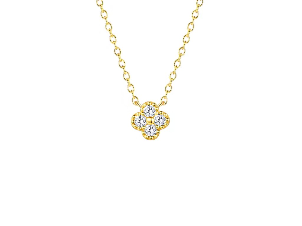 Zlacený náhrdelník ze stříbra 925 zdobí přívěsek ve tvaru čtyřlístku, který je osazen drobnými čirými zirkony. Ty zachycují světlo při každém pohybu a vytváří jemný třpytivý efekt. Precizní zpracování a symetrický tvar dodávají šperku luxusní vzhled, zatímco jeho jemná velikost působí velmi decentně a vkusně.