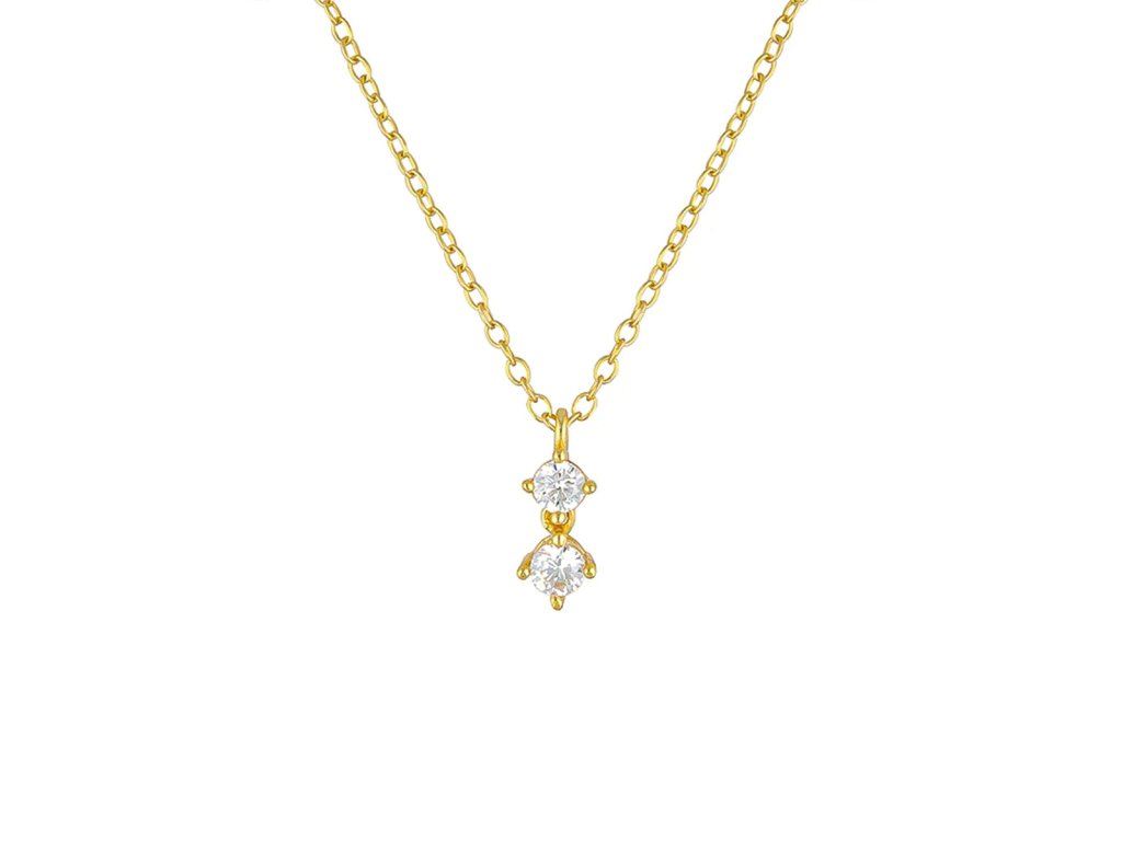 Tento zlacený náhrdelník ze stříbra 925 zdobí dvojice kulatých zirkonů zasazených pod sebou v decentních úchytech. Horní kámen plynule navazuje na jemný řetízek, zatímco spodní se volně pohybuje a při každém kroku zachycuje světlo.