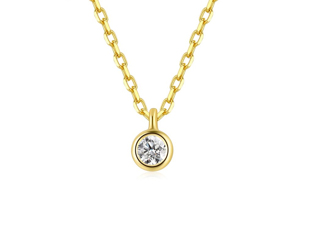 Tento zlacený náhrdelník ze stříbra 925 je ztělesněním jemnosti a vytříbeného stylu. Tenký řetízek nese drobný kulatý přívěsek s čirým zirkonem zasazeným do hladkého lůžka, které zvýrazňuje jeho lesk a třpyt.