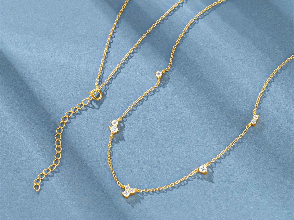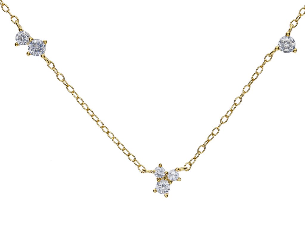 Tento zlacený náhrdelník ze stříbra 925/1000 zdobí několik kulatých čirých zirkonů rovnoměrně rozmístěných podél řetízku. Minimalistický design působí čistě a nadčasově, takže se hodí jak pro každodenní nošení, tak i ke slavnostnějším příležitostem.