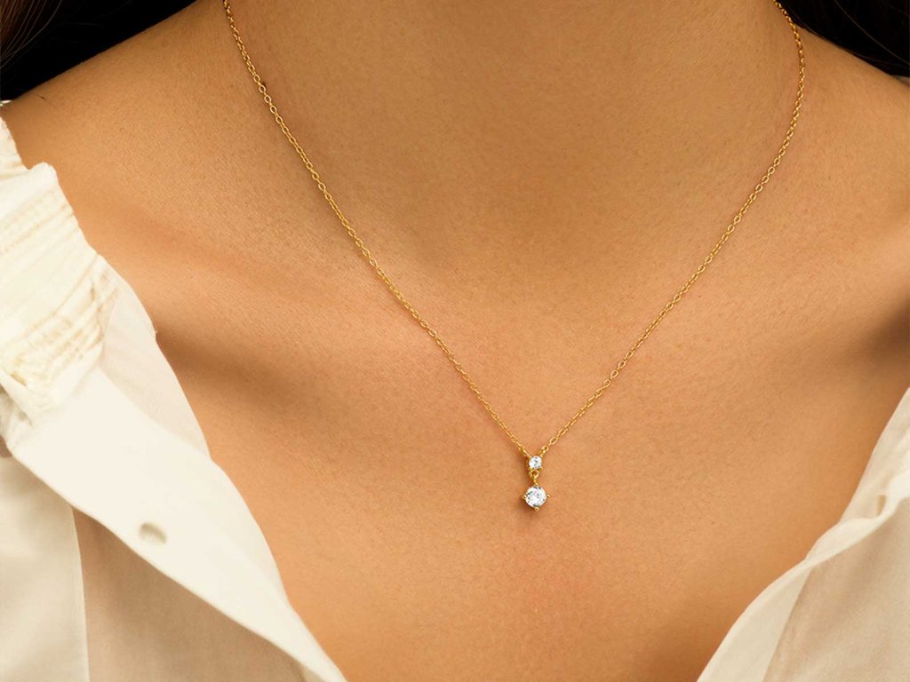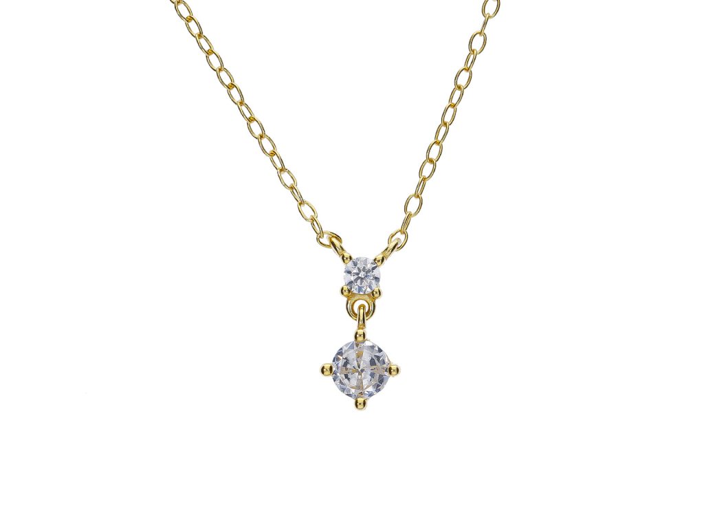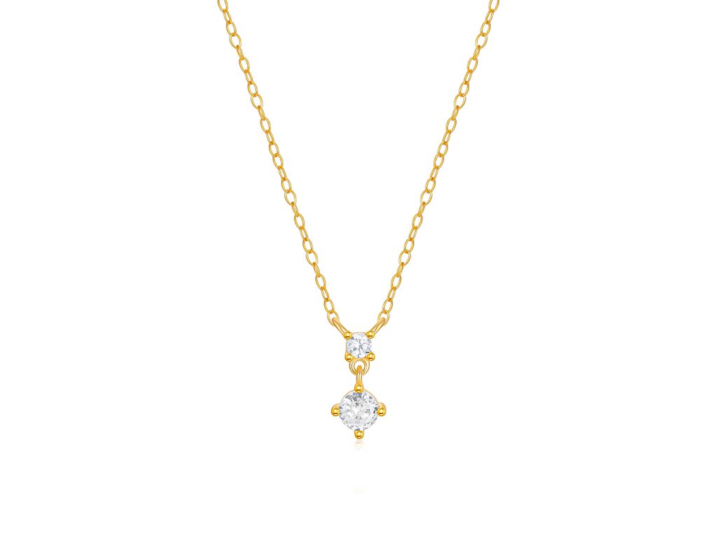 Tento zlacený náhrdelník ze stříbra 925 zdobí dva kulaté zirkony, které vytvářejí jemný vertikální závěs. Horní drobný kámen plynule přechází ve spodní dominantnější zirkon, který se při pohybu lehce třpytí a krásně zachycuje světlo.