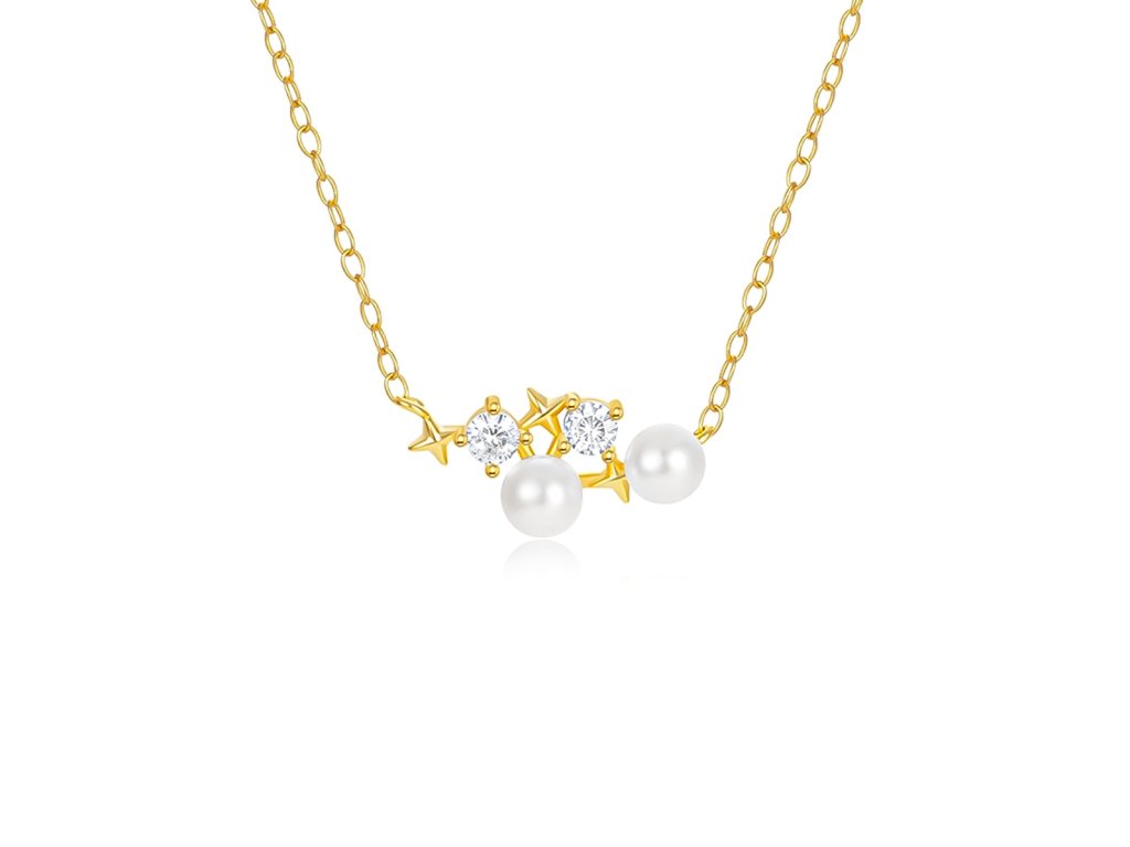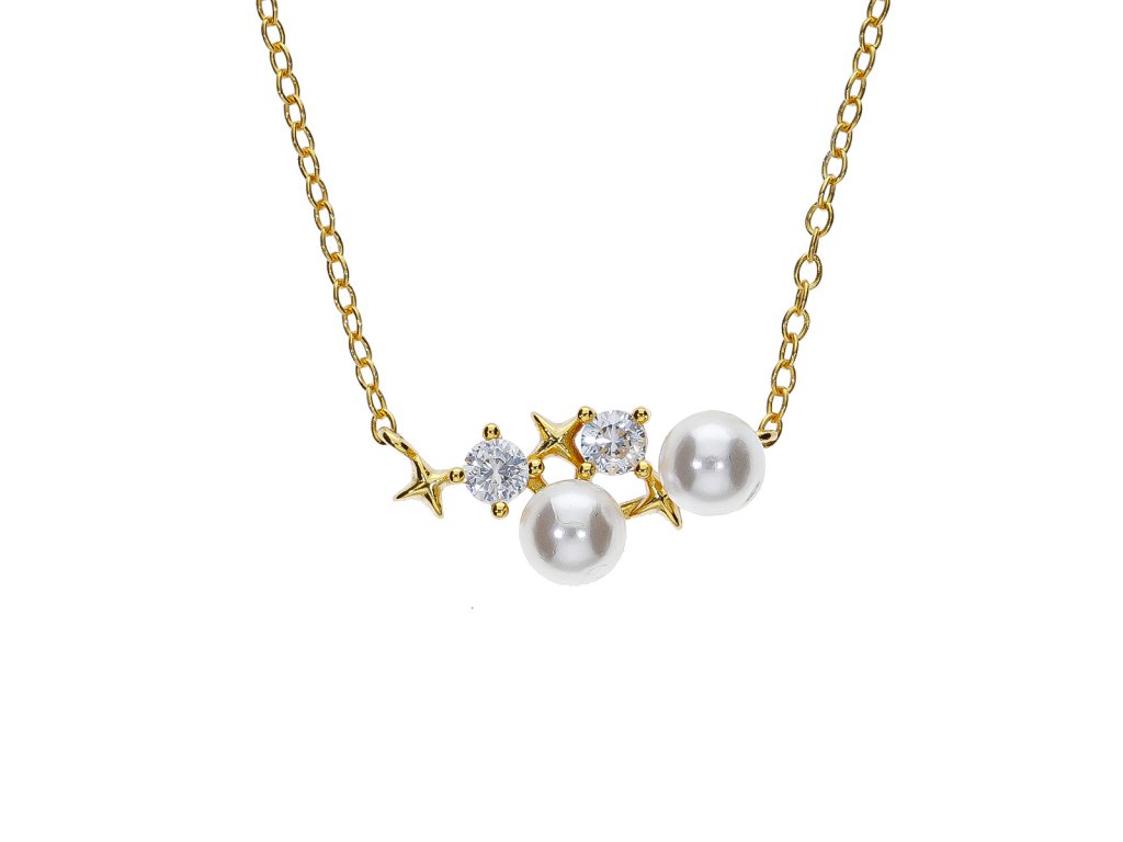 Tento půvabný zlacený náhrdelník ze stříbra 925/1000 spojuje romantický motiv hvězdiček, třpytivých zirkonů a jemných syntetických perel. Kompozice ozdoby působí lehce a harmonicky, jako malé souhvězdí doplněné měsíčním leskem perel.