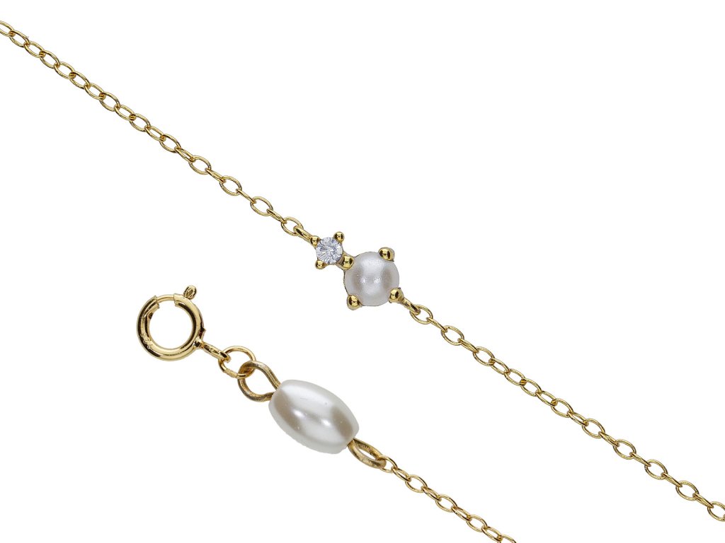 Zlacený náramek ze stříbra je zdoben drobným perlovým prvkem a čirým kamenem, které společně tvoří harmonický a nadčasový detail. Perlový akcent dodává šperku jemnost a ženskost, zatímco třpytivý kámen přináší nádech luxusu.