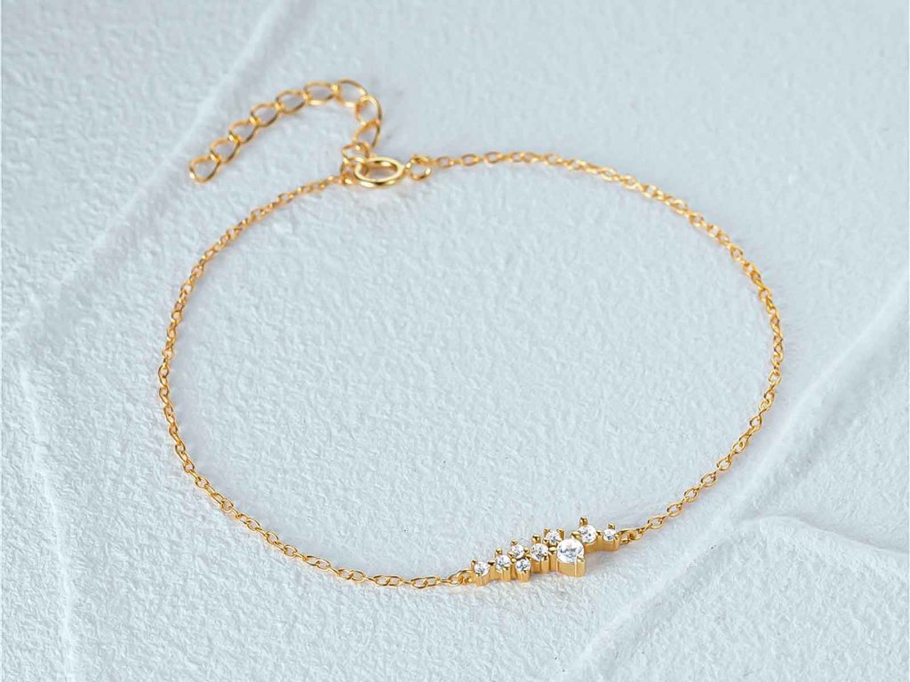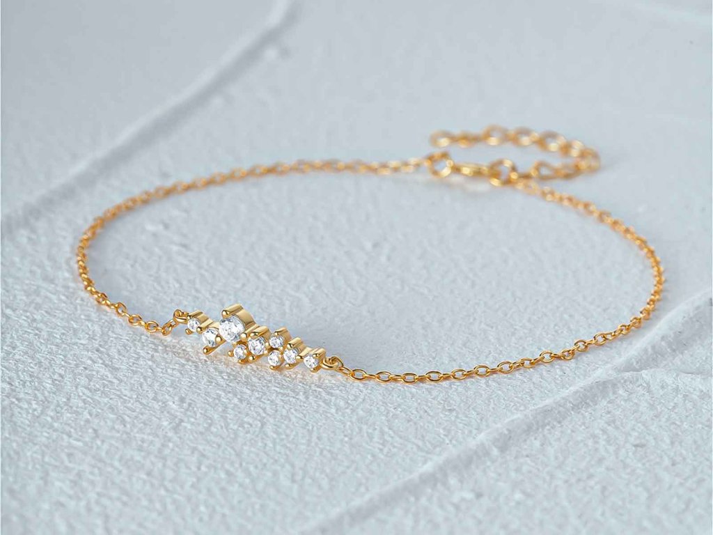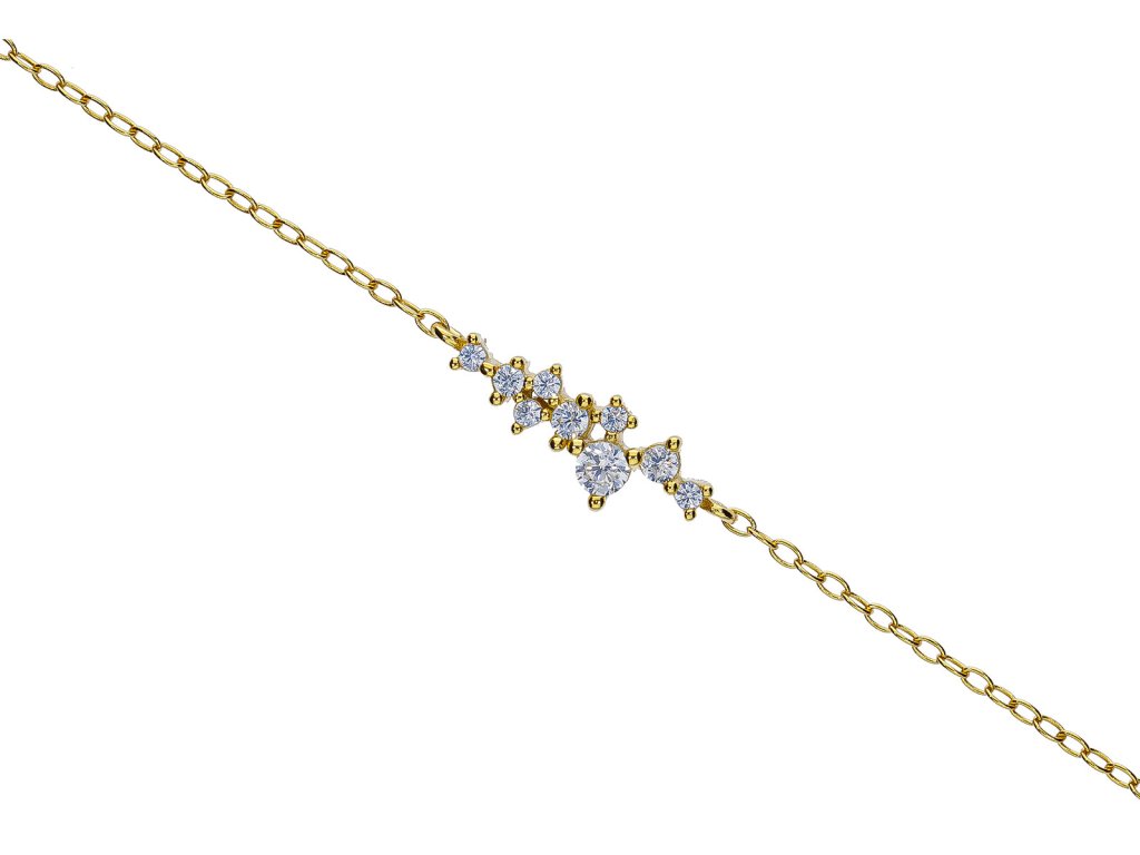 Tento zlacený náramek ze stříbra 925/1000 zdobí podlouhlá ozdoba osazená čirými zirkony, které vytvářejí decentní, ale nepřehlédnutelný třpyt. Elegantní tvar působí lehce a sofistikovaně, díky čemuž je šperk ideální pro každodenní nošení i slavnostnější příležitosti.
