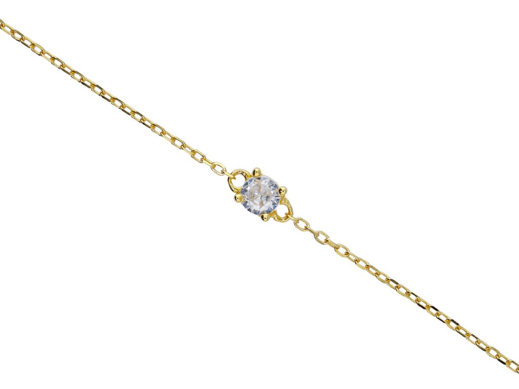 Tento zlacený náramek ze stříbra 925 zdobí kulatý zirkon o velikosti 4 mm, zasazený do jemné čtyřbodové obruby. Čisté linie a drobný třpyt vytvářejí nadčasový design, který podtrhne přirozenou eleganci bez zbytečné okázalosti.